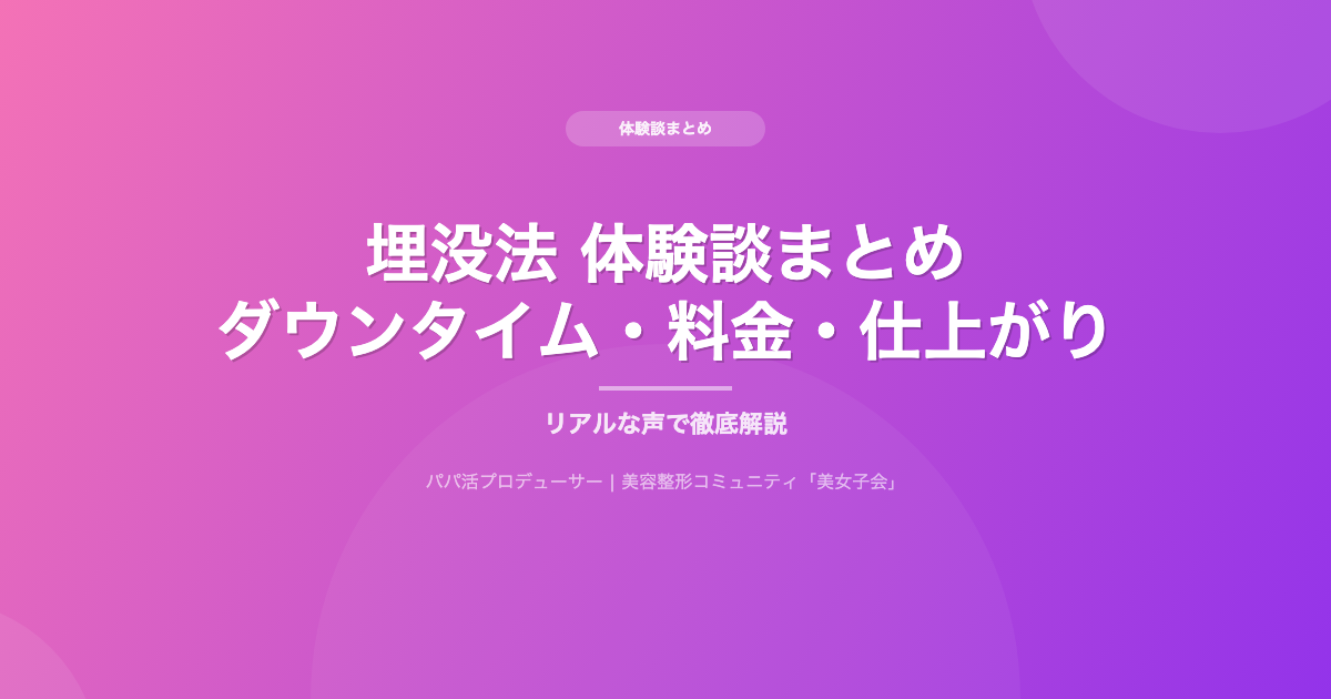 「埋没法を検討しているけど、ダウンタイムがどれくらいか怖くて踏み出せない」「実際にやった人のリアルな声が知りたい」——そんな方のために、日本最大の美容整形コミュニティ「美女子会」(会員数8,000人以上)に寄せられたリアルな体験談をもとに、埋没法のダウンタイム・料金・仕上がりを徹底まとめしました。