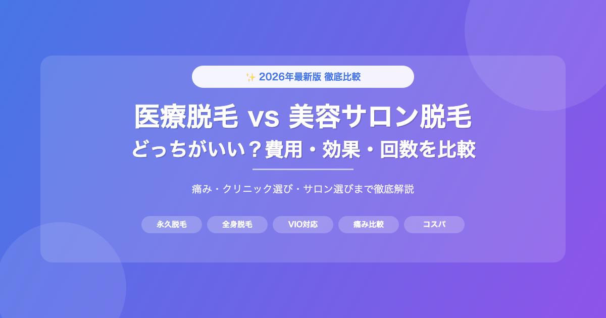 医療脱毛と美容サロン脱毛、どちらにもメリットとデメリットがあります。「確実に永久脱毛したい・通う回数を減らしたい」なら医療脱毛、「痛みを抑えて気軽に始めたい」ならサロン脱毛という選び方が基本です。