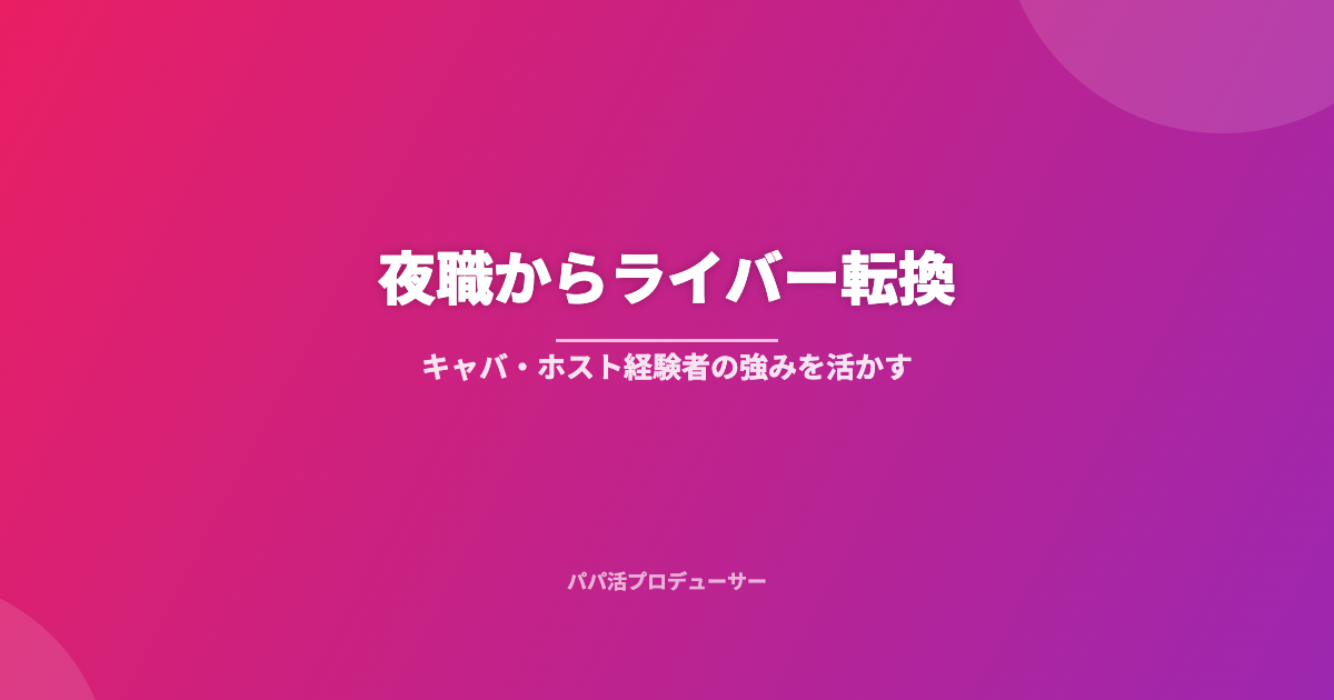 キャバクラ・ホスト・風俗などの夜職で働きながら「そろそろ足を洗いたい」「体力的に続けられない」と感じている方に、ライバーという転換先が注目されています。夜職で培ったコミュニケーション力・場の盛り上げ方・稼ぐマインドは、ライバーとして非常に活きるスキルです。この記事では、夜職からライバーへの転換を成功させる方法を具体的に解説します。