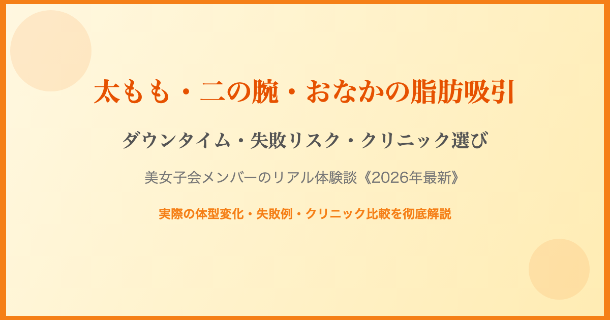 太もも・二の腕・おなかの脂肪吸引は、「下半身を細くしたい」「腕をスッキリさせたい」方に人気の施術です。美女子会メンバーのリアルな体験談をもとに、ダウンタイム・失敗リスク・クリニック選びのポイントを彻底解説します。