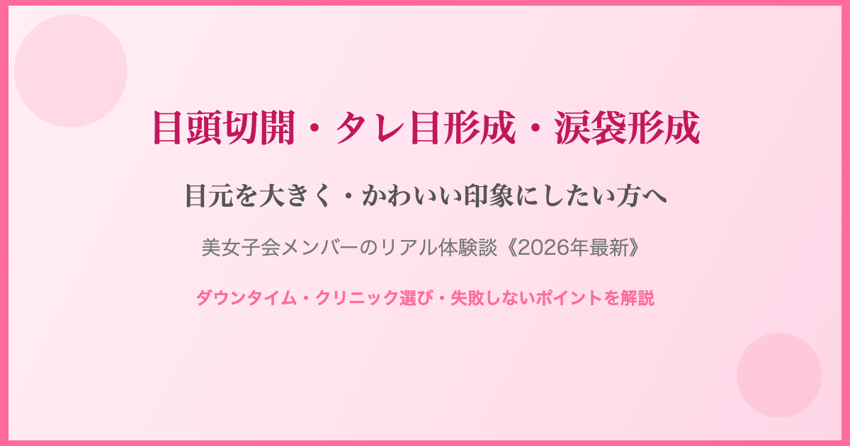 目頭切開・タレ目形成・涙袋形成は、目元を大きく・やわらかく見せたい方に人気の施術です。「パッチリした目にしたい」「垂れ目でかわいい印象にしたい」という方のために、美女子会メンバーのリアルな体験談をもとに施術の特徴・ダウンタイム・クリニック選びのポイントをまとめました。
